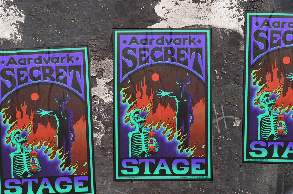To promote the Aardvark Secret Stage, I created a concert poster featuring a looming aardvark overshadowing a skeleton clutching a bottle of Secret Aardvark Hot Sauce. This playful riff on classic heavy metal posters is designed to resonate with our target audience of millennial music fans.